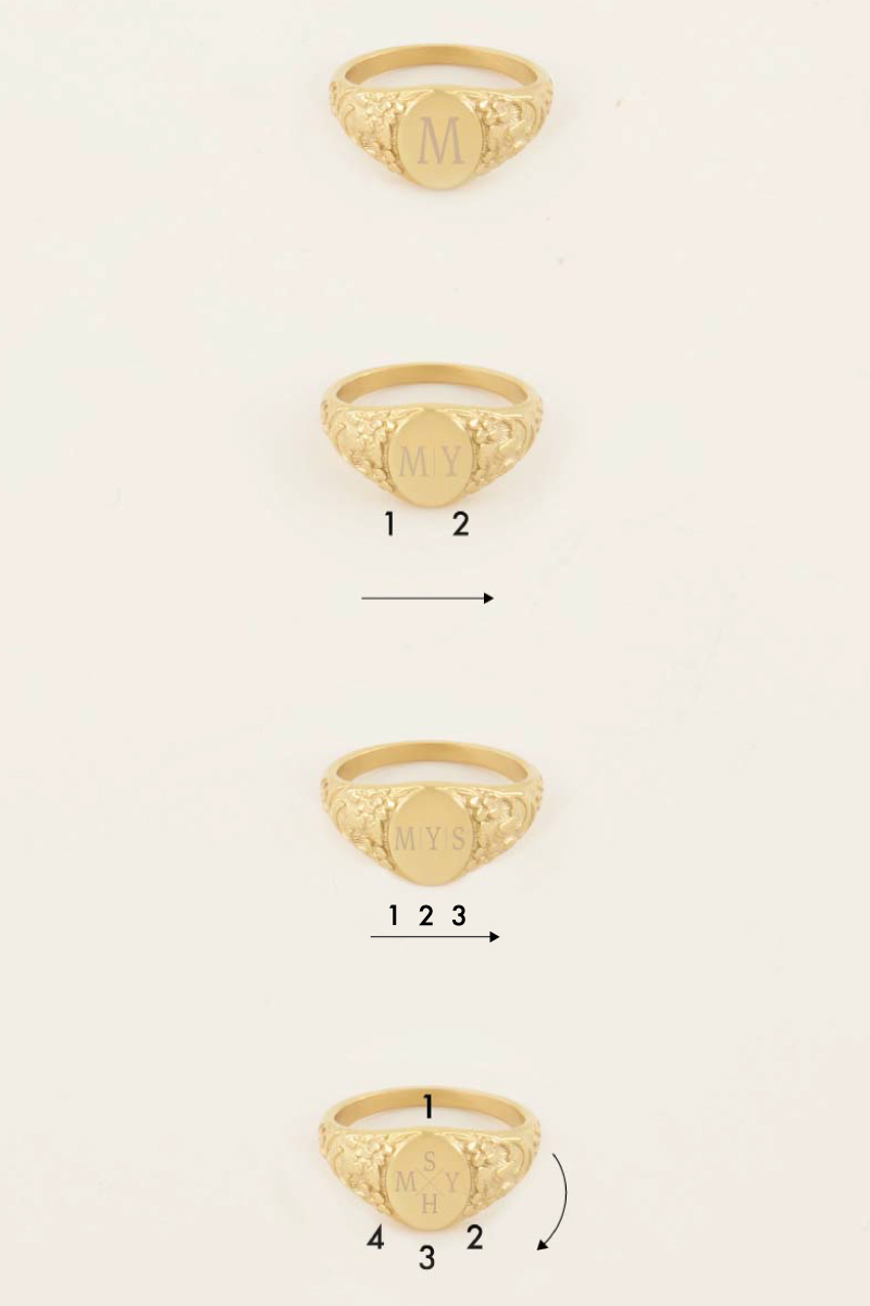 Ontwerp zelf je vintage zegelring en laat het My Jewellery Atelier de ring graveren met één of meerdere letters die voor jou betekenisvol zijn. Be creative! Met een gravering zul je een kenmerkende look creëren die een weerspiegeling van je eigen persoonlijkheid zal zijn. Graveer de initialen van jezelf, een dierbare vriend of een van je familieleden en draag ze dichtbij je. Of geen deze bijzondere ring als cadeau aan je loved ones. Hoe ga jij de ring eigen maken?