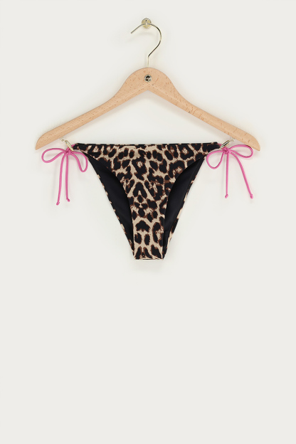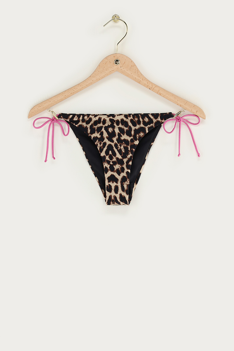 Bruin bikini broekje met panterprint en paarse strikbandjes