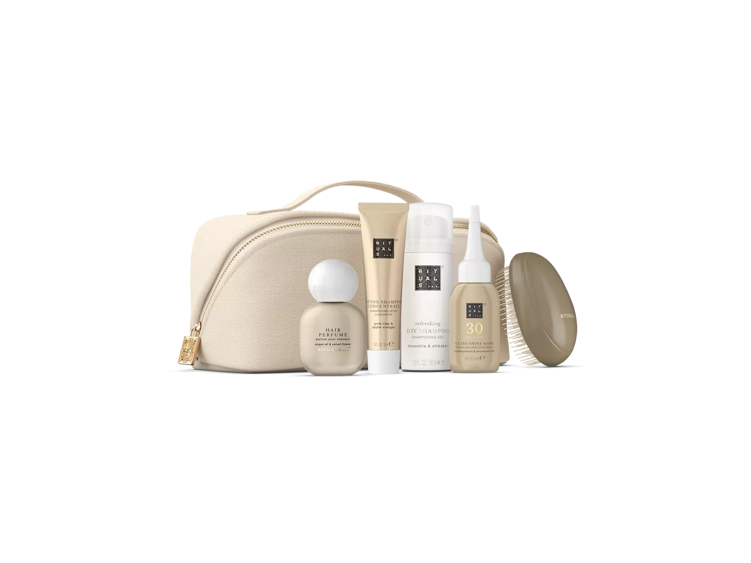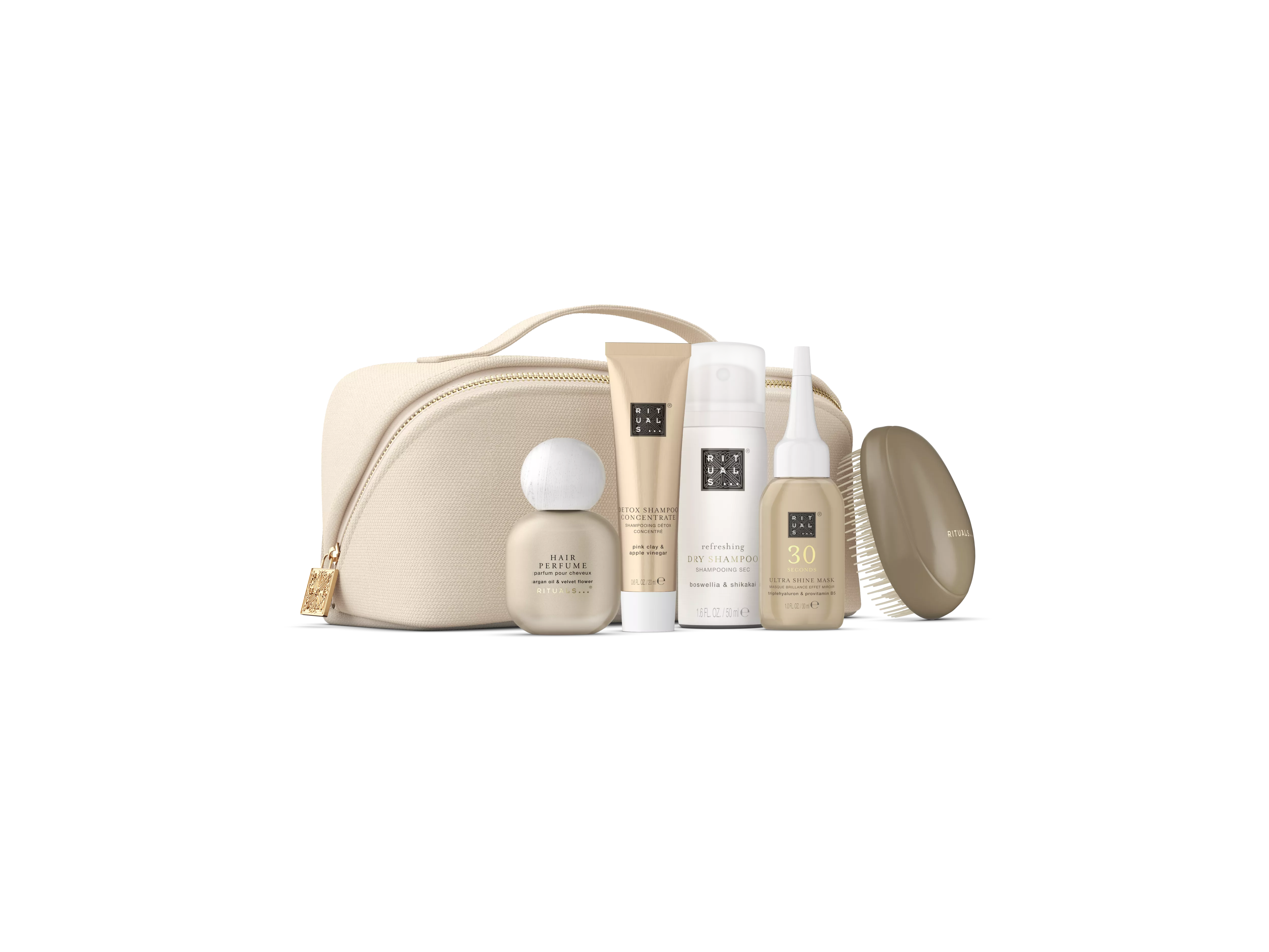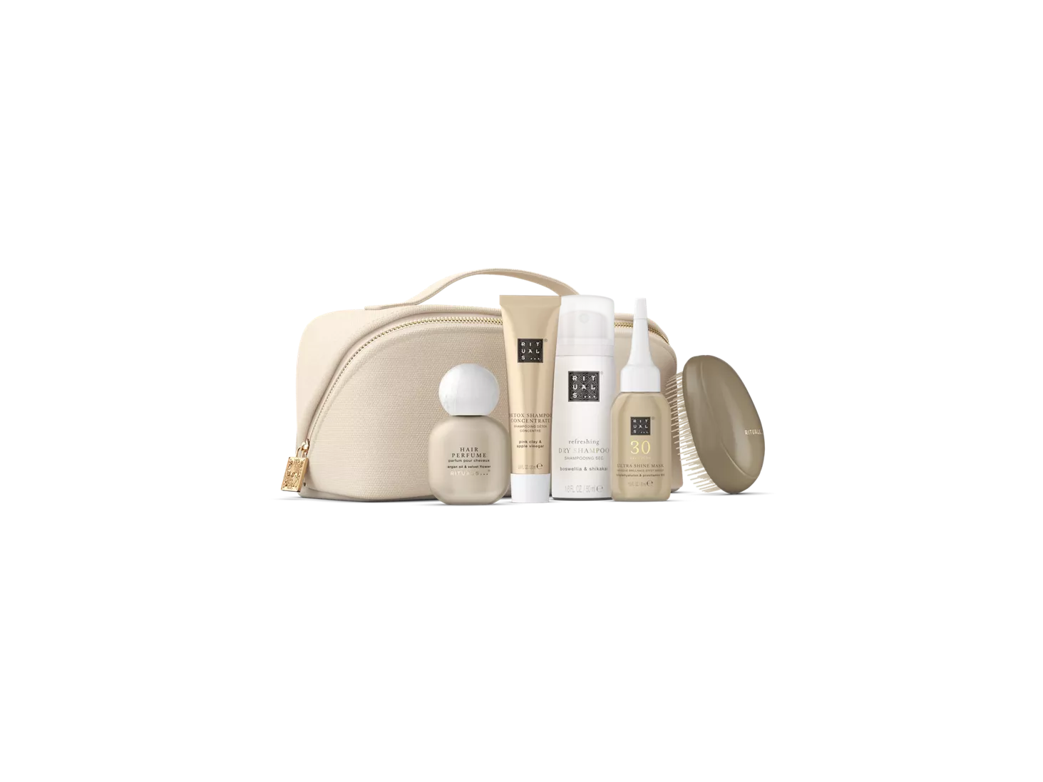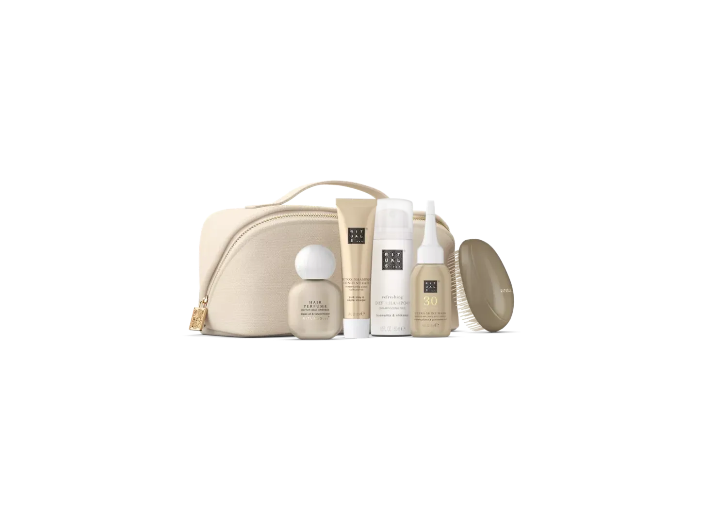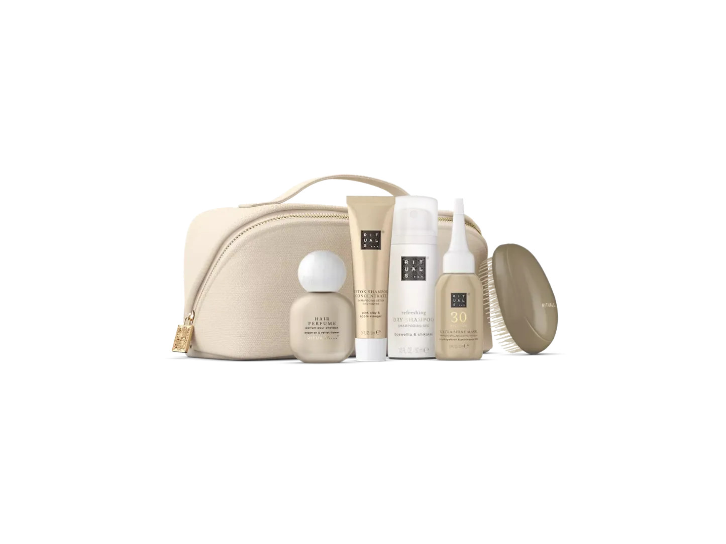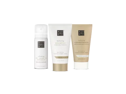 Ontdek je nieuwe haarverzorgingsfavorieten met deze complete set in travelsize. Producten die reinigen, voeden, verfrissen én glans geven - ze zitten allemaal deze mooie en herbruikbare pouch.