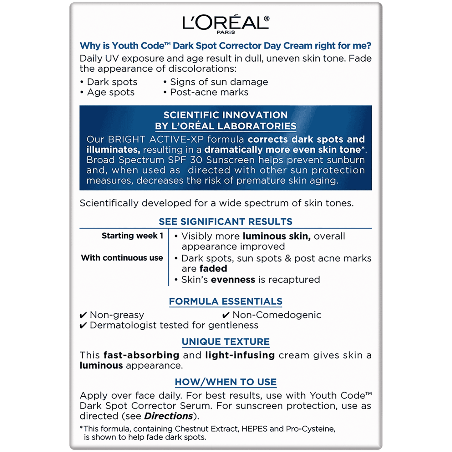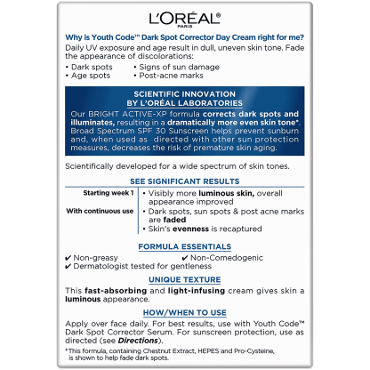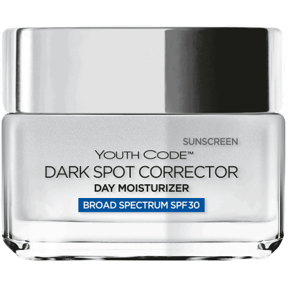 Fact: Helps fade the appearance of dark spots, age spots, sun damage and post acne marks that can make skin appear up to 10 years older. Restore luminosity and fight discoloration with Youth Code Dark Spot Correcting & Illuminating SPF 30 Day Cream. This rich, hydrating formula prevents future discolorations from forming while minimizing the appearance of existing dark spots for a more even, radiant and youthful complexion. Specifically developed for a wide spectrum of skin types and tones.